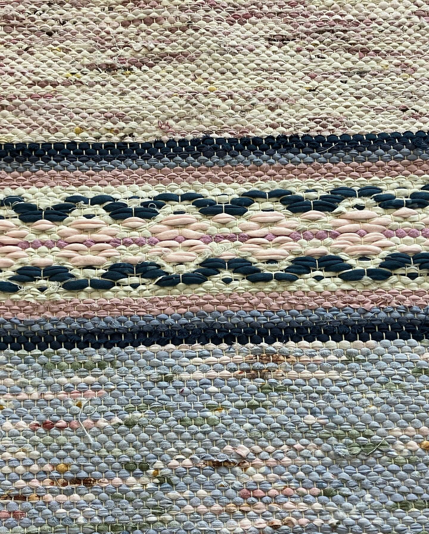Matta är vävd i rosengång och tuskaft i ljus varp. Återbrukat material så som lakan men trikån är delvis köpt.